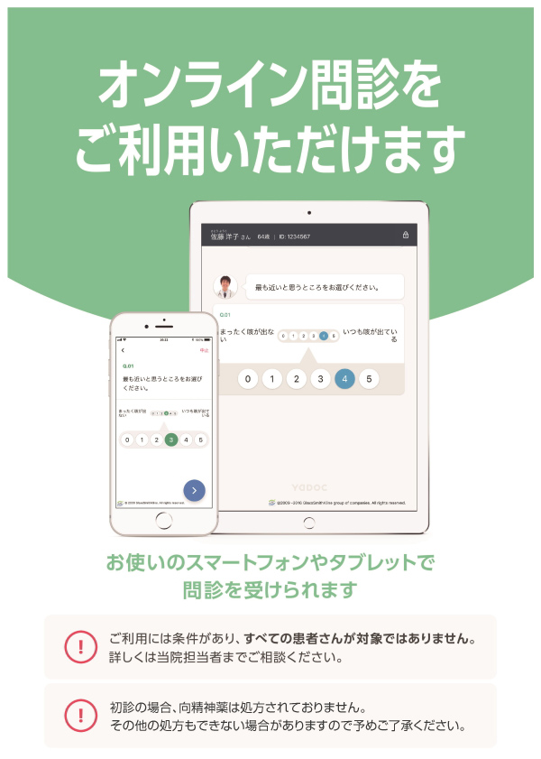 オンライン診療については、医療機関によって「一定の条件を満たす患者さんにのみ実施している場合」や「まだ実施をしておらず導入を検討している場合」もあります。オンライン診療の利用を希望される方は、受診する医療機関がオンライン診療に対応しているかどうか、あらかじめ確認されることをおすすめします。